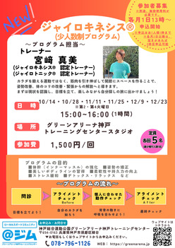 55歳以上限定!GOGO!!キャンペーン グリーンアリーナ神戸トレーニングセンターを初めてご利用の55歳以上の方へ、様々な特典付きのお得なキャンペーンを実施します! 秋からスタート!安心・お得にジムデビュー! 10/26(日)おそとであそぼう!【雨天の場合は11/1(土)に延期となります】 神戸総合運動公園コスモスの丘上広場にてイベントを開催!! 親子で楽しめる体操や楽しいゲームが盛りだくさん!! いつもとちがう野外で思いっきりかけまわっちゃおう!! グリーンアリーナ神戸トレーニングセンター初回利用のご案内 初めてグリーンアリーナ神戸トレーニングセンターをご利用になる方は、「はじめてサポート」の受講と登録が必要です。 トレーニングジムや施設の利用方法、マシンの使用方法など、スタッフが丁寧に説明させていただきますので、「初めてトレーニングジムを利用する」、「ひとりで不安」という方もご安心ください♪ ジャイロキネシス® 少人数制プログラム カラダを鍛える運動ではなく、筋肉を引き伸ばして関節にスペースをつくることで、姿勢改善、体のコリの改善、緊張からの解放へと導きます。 まずは現状を認識し、目標を立て、楽しみながら自分探しの旅に出かけましょう! KAYAメソッドストレッチ【要予約】 ★プログラムの特徴・目的★ ・カラダが変わると人生が変わる ・普段使わない内層筋 ・疲れにくいカラダづくり ・背骨に隙間を作り体調を整える ・ニュートラルな姿勢づくり ・カラダを緩めて緊張からの解放 みんなの体力測定@ジム 【参加無料】予約不要 ★参加者限定特典あり★ 未来につながる健康・体力づくり「みんなの体力測定@ジム」を開催! 参加無料!事前予約不要!どなたでもご参加いただけます! いつまでも元気に動ける体づくりの第一歩! 体力測定で現状の体力・カラダ年齢を確認してみませんか? SUMAビーチモルック大会2025 須磨海岸(神戸市須磨区)を会場に、SUMAビーチモルック大会を開催! 同会場にて、「Suma豊かな海フェスタ2025」も同日開催され、ミニライブなどのステージや体験ブース、須磨の海を知る展示ブースなど、イベント盛りだくさん! 地元の農家さんやお店が出店する「EAT LOCAL KOBE ファーマーズマーケット」も開催されます! 須磨離宮公園お月見ヨガ開催 10/4(土)、神戸市立須磨離宮公園にてお月見ヨガを開催。 月夜の下で夜風を感じ、ヨガでリフレッシュしましょう。 琴やフラダンスなどのステージ、月の観察会、月見茶会など、『第37回 離宮月見の宴』 も同日開催!イベント当日は、入園料無料! はじめよう!!フットサル(初心者向けフットサルクリニック) はじめよう!!フットサルは、パスやドリブルなど基礎練習を中心とした、初心者の方を対象としたフットサルクリニックで、通称『はじサル』! 現役フットサル、サッカープレイヤーのコーチが、楽しく愉快にフットサルの魅力を伝えます! 第1回 森林植物園モルック大会 フィンランド生まれの誰でも楽しめるユニバーサルスポーツ「モルック」。 小学生からご参加いただける本大会の会場は、初開催となる神戸市立森林植物園内の多目的広場! 予選ラウンド3試合の結果、上位8チームがファイナルラウンドに進み、優勝チームには賞品を贈呈☆★さぁ、チームをつくってモルックを楽しみましょう! お知らせ・イベント情報をもっと見る