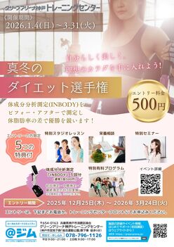 全 28 件 [ 1 ~ 20 件目 ] « < 1 2 > » 新春お年玉キャンペーン 新年最初の運試し! グリーンアリーナ神戸トレーニングセンターを初めてご利用のすべての方へ、様々な特典付き!12月限定のお得なキャンペーンを実施します!この機会に、安心・お得にジムデビュー! 神戸でモルック!カップ フィンランド発祥!近年話題のニュースポーツ『モルック』!神戸総合運動公園の 広々としたグラウンドでの大会 「神戸でモルック!カップ」を開催!上位で賞品GET!小学生からご参加いただけます。 真冬のダイエット選手権2026 ダイエット月間とし、1月から3月まで3カ月で体脂肪減少率を競う、『真冬のダイエット選手権』が今年も開催! ご参加いただいた方には、特別レッスン・プログラムの受講やセミナーなど魅力的な特典がいっぱい! 自分らしく美しく。理想のカラダを手にいれよう! 春得キャンペーン 春からはじめる、お得にジムデビュー! 初めてトレーニングセンターをご登録いただいた方へお得な③つの特典!!! さらに、新規登録者様限定に定期券購入特典もございます。 ご来館、お待ちしております♪ 大人のための卓球教室 冬期クラス (1月~3月)会員募集中! 初心者から経験者まで、1人1人のスキルに合わせて、上級指導員の講師が丁寧に指導します! ウォーキングイベント ~塩屋のまちを歩く、海苔工場見学ツアー~ 中距離ウォーキングにチャレンジ!垂水区にある小さな海辺の町「塩屋」を巡った後、須磨の海を堪能するイベントを企画。ウォーキング初心者の方でも気軽にご参加できます。今季は、須磨海岸にて養殖している”海苔”の工場内を見学でき、今シーズンの新海苔を試食できます!さぁ、おにぎり持参だぁ! KAYAメソッド®ストレッチ【要予約】 腰痛、肩こり、頸の痛みは主に緊張からきています。 身体を動かしてほぐす。ゆるめてつながえてめぐらせる。「正しい」ではなく、その人に「合う」ストレッチ。力技でしない、身体の作りに合った順序に沿ったストレッチがあります。自宅でいつでも出来るストレッチを一緒に学びませんか。 ジャイロキネシス® 少人数制プログラム カラダを鍛える運動ではなく、筋肉を引き伸ばして関節にスペースをつくることで、姿勢改善、体のコリの改善、緊張からの解放へと導きます。 まずは現状を認識し、目標を立て、楽しみながら自分探しの旅に出かけましょう! SPECIAL LESSON 2025 ~ WINTER ~ 神戸総合運動公園トレーニングセンター・スタジオ内にて開催★ この冬だけの特別レッスンが勢ぞろい!心も体もあたたまる4つのプログラム。 年末をもっと楽しく過ごせるスペシャルイベントです! 親子向け教室情報 年代別に教室を開講しています♪ 親子体操教室の内容やおすすめポイントをご紹介します☆ 各教室・幼児向けイベントのお申し込みもこちらから★ ベビーマッサージ教室 誕生後すぐにタッチケアを通じたコミュニケーションを行うことで、赤ちゃんの心と体の発育を促します。 親子体操教室~1歳クラス~ 神経系の発達が著しいこの時期! 小さい頃からたくさんの音楽や運動にふれあうことは、発育発達に効果的♪♪手遊びやリズム体操、跳び箱やボールをつかいながら、楽しくからだを動かしましょう☆ 親子体操教室~2・3歳クラス~ 満2,3歳対象の親子体操教室! 親子でコミュニケーションをとりながら運動神経やリズム感、協調性を身につけていきます! たくさんの運動、音楽にふれあい楽しくからだを動かしましょう☆ 「英語×スポーツ教室」参加者募集中! こんな習い事、待っていた! ➀「英語」と「スポーツ・体験」、人気の習い事が1度にできる! ②英語ネイティブのコーチ指導でグローバルなお子様に育てます! はじめよう!!フットサル(初心者向けフットサルクリニック) はじめよう!!フットサルは、パスやドリブルなど基礎練習を中心とした、初心者の方を対象としたフットサルクリニックで、通称『はじサル』! 現役フットサル、サッカープレイヤーのコーチが、楽しく愉快にフットサルの魅力を伝えます! 大人のための卓球教室 秋期クラス (9月~12月)会員募集中! 初心者から経験者まで、1人1人のスキルに合わせて、上級指導員の講師が丁寧に指導します! グリーンアリーナ神戸トレーニングセンター初回利用のご案内 初めてグリーンアリーナ神戸トレーニングセンターをご利用になる方は、「はじめてサポート」の受講と登録が必要です。トレーニングジムや施設の利用方法、マシンの使用方法など、スタッフが丁寧に説明させていただきますので、「初めてトレーニングジムを利用する」、「ひとりで不安」という方もご安心ください♪ みんなの体力測定@ジム 【参加無料】予約不要 ★参加者限定特典あり★ 未来につながる健康・体力づくり「みんなの体力測定@ジム」を開催! 参加無料!事前予約不要!どなたでもご参加いただけます! いつまでも元気に動ける体づくりの第一歩! 体力測定で現状の体力・カラダ年齢を確認してみませんか? グリーンアリーナ神戸スタッフ(パート・アルバ